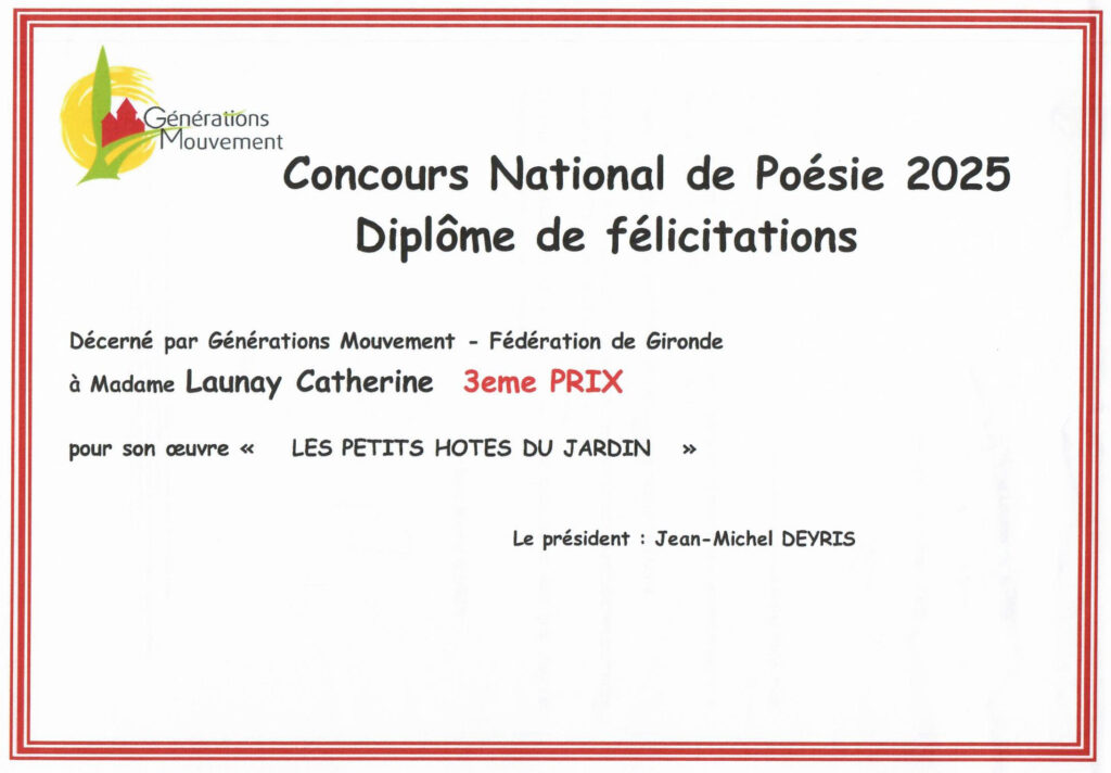 La poésie c’est l’art d’évoquer des sensations, des impressions, des émotions avec de simples mots mais pas sous n’importe quelle forme. Chaque année, la Fédération Générations Mouvement de la Gironde organise un concours de poésie accessible à tous les adhérents de notre Mouvement.