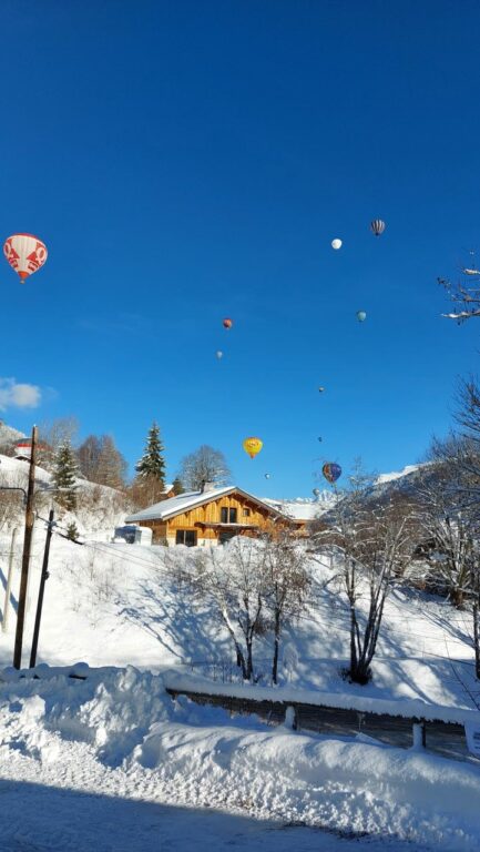 Spectacle du dimanche matin : le soleil est au rendez-vous et nous accompagne toute la semaine ; c’est la découverte d’un paysage féerique et le groupe « Raquettes » attendu par les guides, part à la conquête des pentes tandis que les autres découvrent le village. En cette 2e semaine de janvier, Praz organise la 35ème édition des Mongolfiades internationales. Ce sera un spectacle quotidien jusqu’à notre départ.
